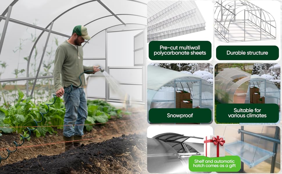 Tähän malliin on mahdollista ostaa lisäksi kattoluukku automaattisella luukunavaajalla, hylly ja kasvien sidontasarja.